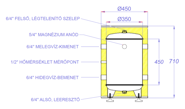 - Acéllemez tartály test, belső zománcozással, Mg anód védelemmel